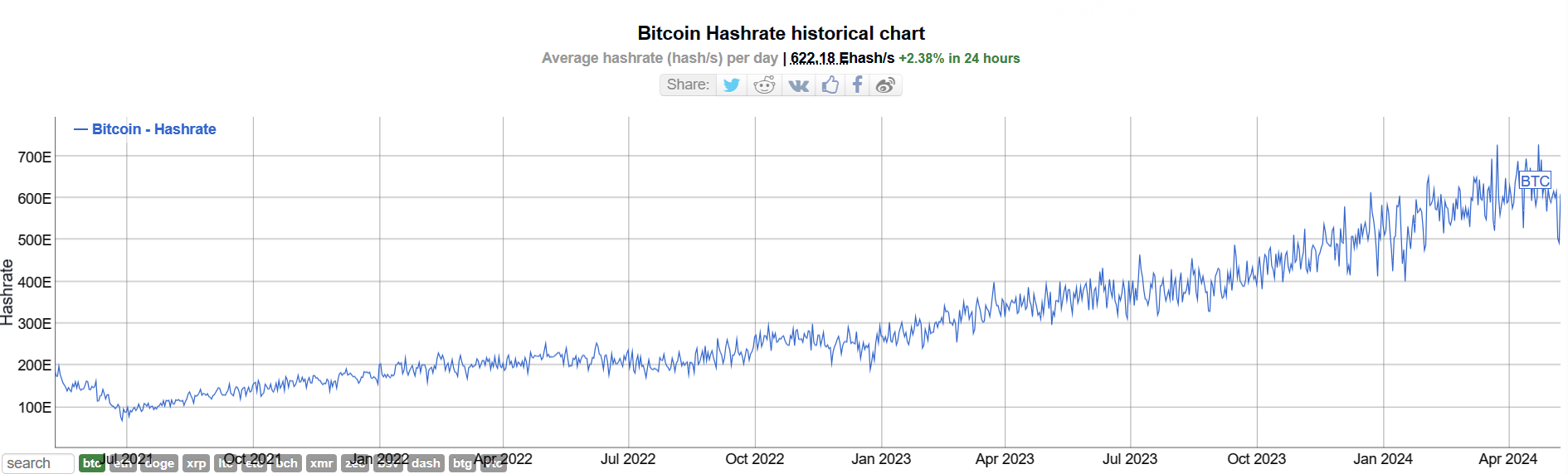 그리고 해시레이트(채굴자들의 평균 연산속도 : 채굴 참여자가 늘수록 상승)인데 추세를 보는 것입니다.