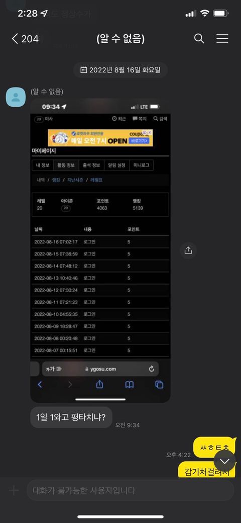 제 닉네임이 나와 있는 사진을 보여주며 얘기를 나눈 카톡이 있는데