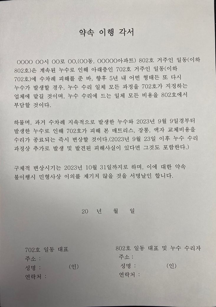 (※각서 서명자는 위층남자(수리자)가 할 예정입니다/ 위층 여자및 그 자녀들은 전부 위층에삽니다)