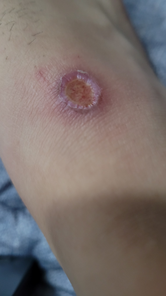 심부 2도 화상이 관찰됩니다. 당장은 연고바르시면서 감염증이 발생하지 않게 주의하셔야 하는데, 상처 회복이 더딜 수 있고 이 경우 중앙부의 가피를 제거해주어야 하므로 가까운 피부과나 외과를 방문해보시기 바랍니다.