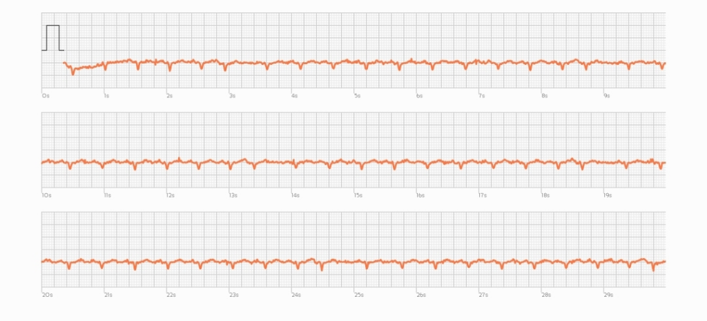 중간중간 리듬이 맞지 않는 부분이 보입니다만 이 리듬이 심실조기수축때문인지는 심전도를 검사해보아야 알 수 있습니다. 검사할 수 있는 내과를 방문해보시는게 좋겠습니다.