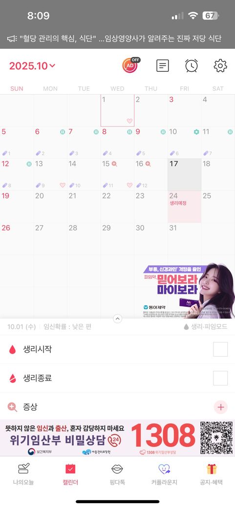 관계는 1,9,10,13,15일에 가졌습니다. 피임약 복용 기록