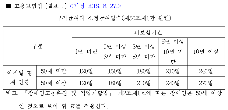 구직급여 지급액은 "퇴직전 평균임금의 60%*소정급여일수"로 산정하되, 상한액은 1일 66,000원, 하한액은 퇴직 당시 최저임금법상 시간급 최저임금의 80% X 1일 소정근로시간 (8시간)입니다. 즉, 최종 회사에서 퇴직 전 3개월 동안에 지급된 임금이 많을수록 구직급여는 많아지나, 1일 66,000원을 초과할 수 없으며, 퇴직 전 3개월 동안에 지급된 임금이 하한액보다 낮을 경우에는 하한액 산정기준인 1일 소정근로시간이 많을 수록 구직급여는 많아집니다. 소정급여일수는 연령 및 피보험기간에 따라 다음과 같이 차등하여 부여됩니다.