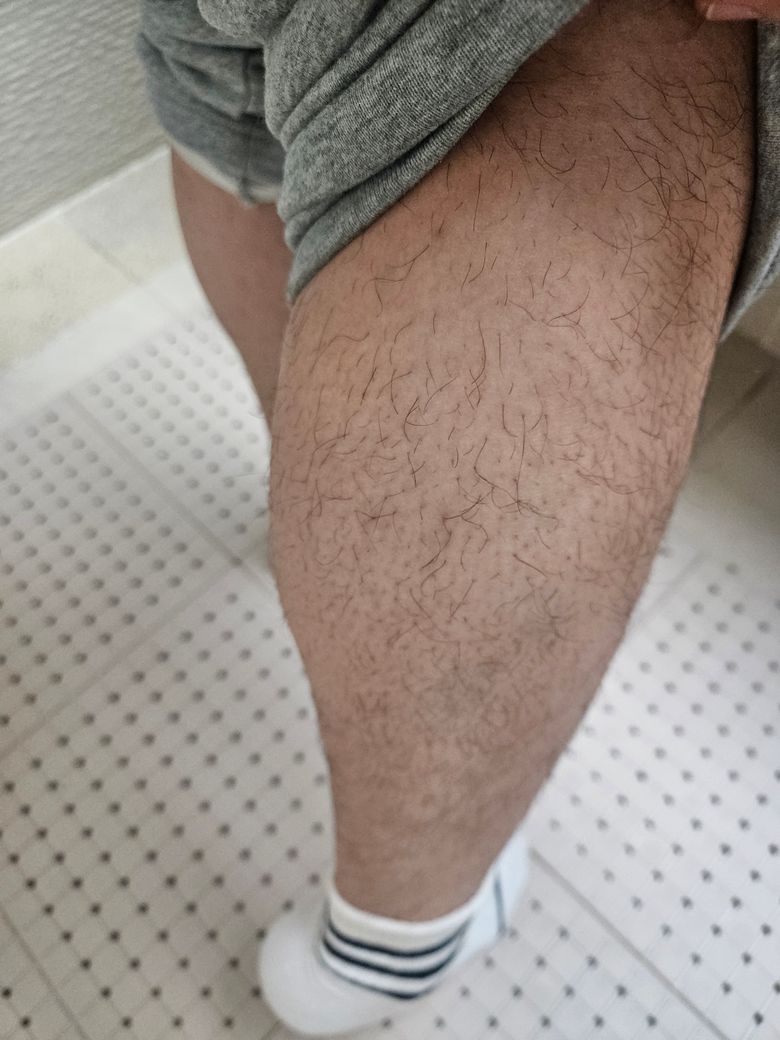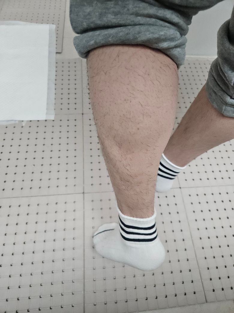 해당 사진은 왼쪽 종아리이며 보니 옆에 사진처럼 선이 들어가면서 알 배긴거 같은 모양과 뒤에선 사진처럼 처음보는 모양이 나옵니다.