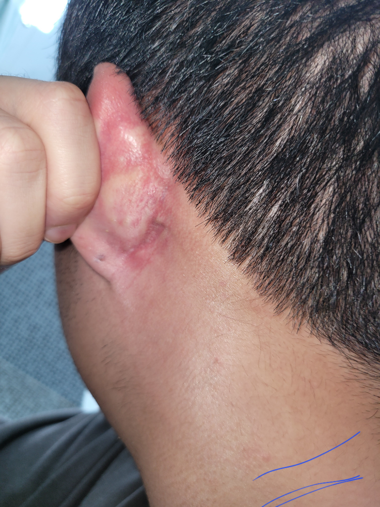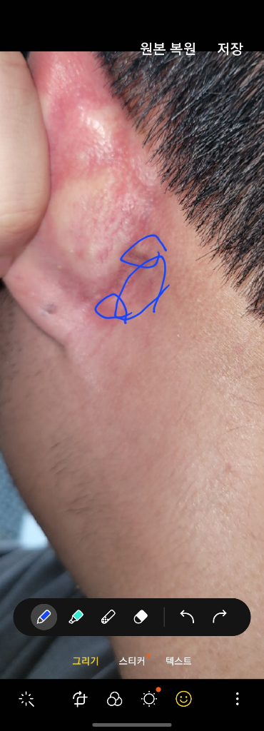 귀뒤에 피부가 겹치는 부분에 피부염이 발생하신 것 같습니다.
