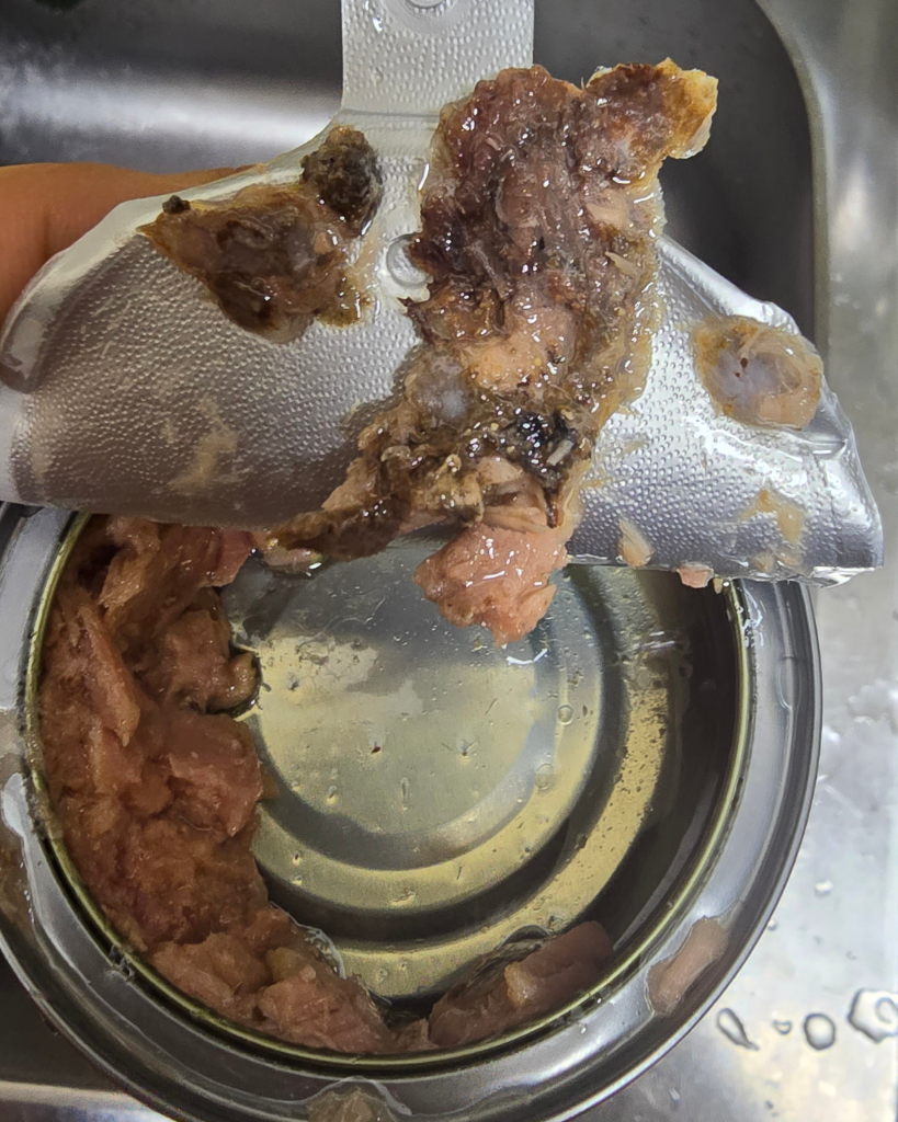 보이는것처럼 검게 변한 부분들이 있고 손가락으로 쉽게 바스라질정도의 얇고 약간 단단한 부분도 있습니다 냄새는 그냥 평펌한 살코기 색보다 비리고 이상한 냄새가 납니다 이부분맘 걷어내면 먹어도 상관없을까요..?
