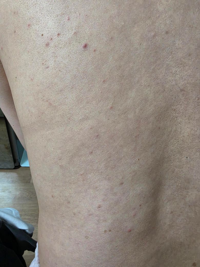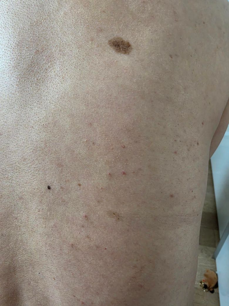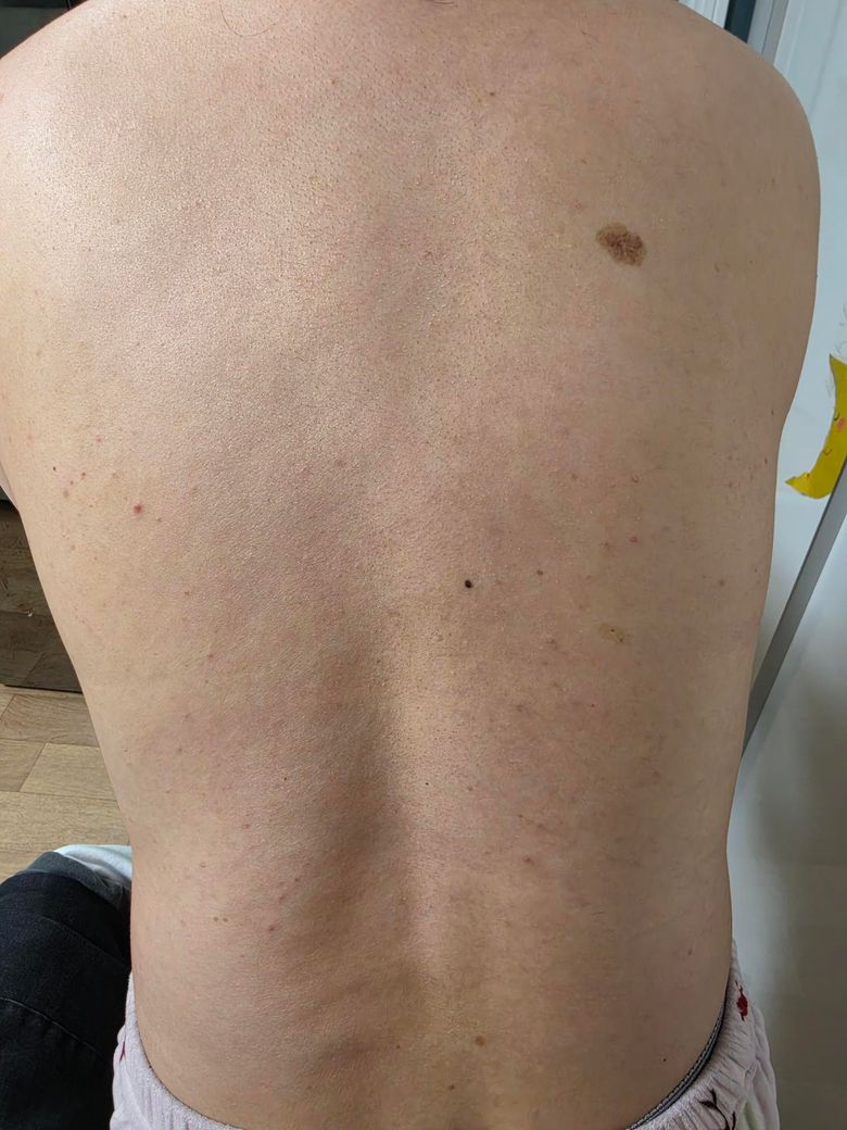 첫 번째 사진의 등 전체에 걸친 붉은 구진(작은 돌기)들과 두 번째 사진의 갈색 색소 병변은, 현재로서는 대상포진의 전형적인 양상과는 다소 거리가 있어 보입니다. 대상포진은 통상적으로 신경절을 따라 한쪽 방향으로만 띠 모양으로 분포하며, 초기에 극심한 작열감이나 감각 이상이 선행하는 것이 특징입니다. 사진의 병변들은 양측으로 산재되어 있고 수포 형성도 보이지 않아, 대상포진보다는 모낭염(folliculitis), 구진성 두드러기, 또는 바이러스 감염에 동반되는 비특이적 피부 반응에 가까워 보입니다.