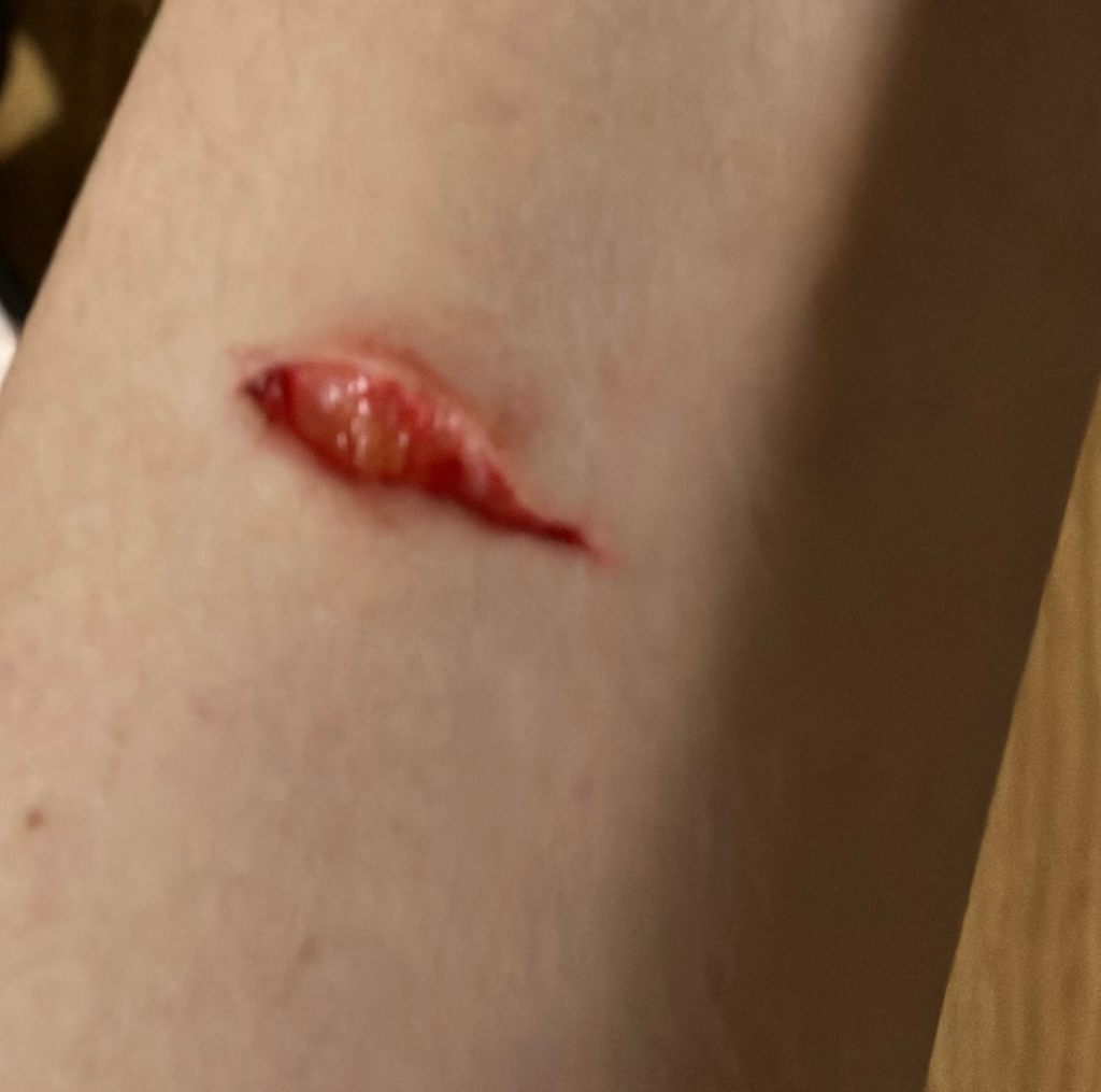 회복에 긴 시간이 필요해 보이며 흉터가 생길 가능성이 높아보입니다. 봉합을 위해 응급실을 방문하시기 바랍니다.