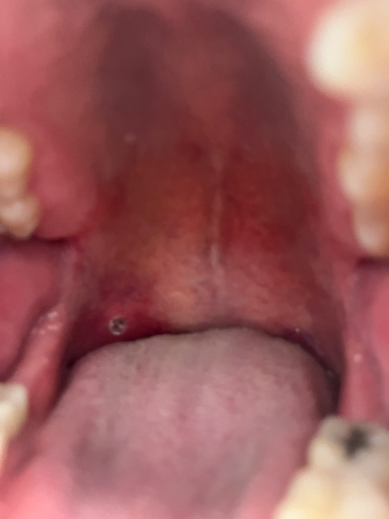 어제 부터 입천장에 구내염의 흰색이 나다. 오늘 알보칠로 치료하였고, 저녁에 약을 바르기 위해 발랐더니 흰색 껍질이 벗겨지면서 현재 사진과 같이 흰색 + 검정반점이 안에 있는데요 ㅠㅠ