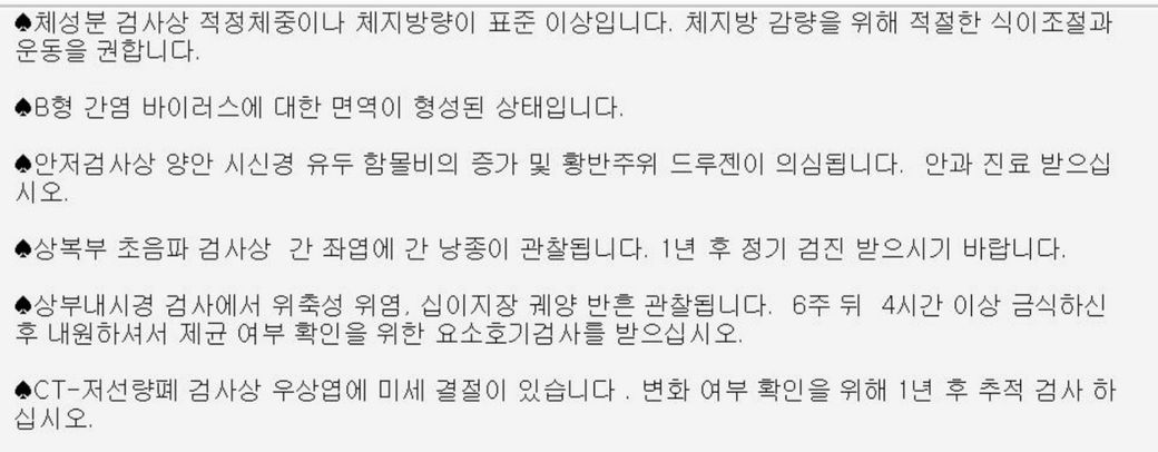 종합검진 결과가 나왔는데 검진결과에 대한 자세한 설명 부탁 드립니다.