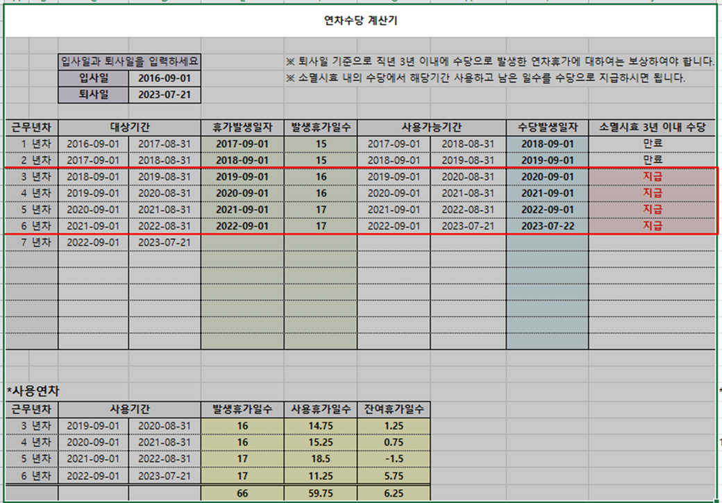 연차수당 청구권 발생일로부터 3년입니다. 따라서 표에 수당발생일자로부터 3년이 지나지 않은 부분은 전부 청구가 가능하다고