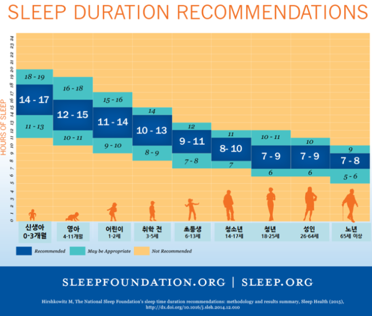 미 국립수면 재단에서 여러 연구결과를 종합해서 제시한 가이드라인입니다. 그리고 6시간 이내 수면은 건강에 명백히 해롭다고 알려져 있습니다. 수면을 충분히 하면 증상이 없어질 것으로 보입니다.