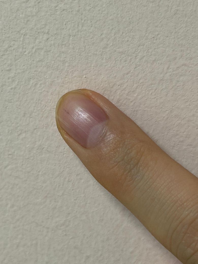 사진상 손톱 중앙에 가느다란 세로선이 보입니다. 색이 옅고 굵기가 일정하며 주변 피부 변화가 없다면, 대부분은 정상적인 손톱 세로 능선(onychorrhexis) 가능성이 높습니다.