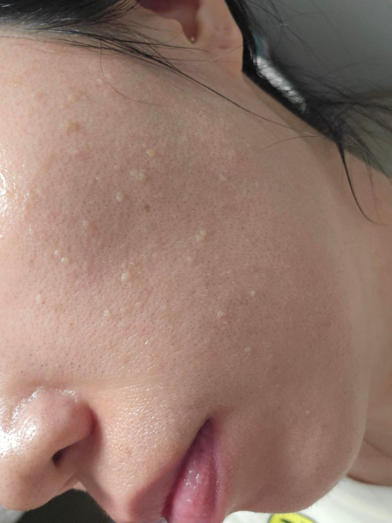 사진에서 보이는 병변은 피부색 또는 약간 노란색의 매우 작은 돌기들이 모공을 따라 다수 분포하는 형태입니다. 표면이 비교적 매끈하고 중심이 모공과 연결된 것처럼 보이는 점을 고려하면, 임상적으로는 좁쌀여드름(폐쇄면포, closed comedone) 가능성이 가장 높습니다. 비립종이나 사마귀와는 형태가 다소 다릅니다.