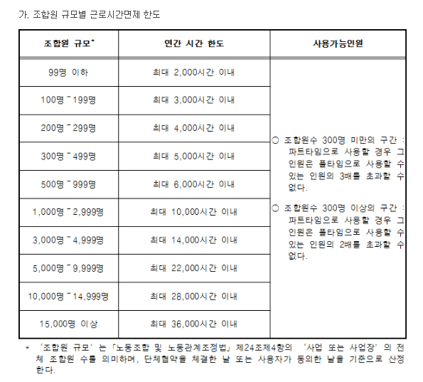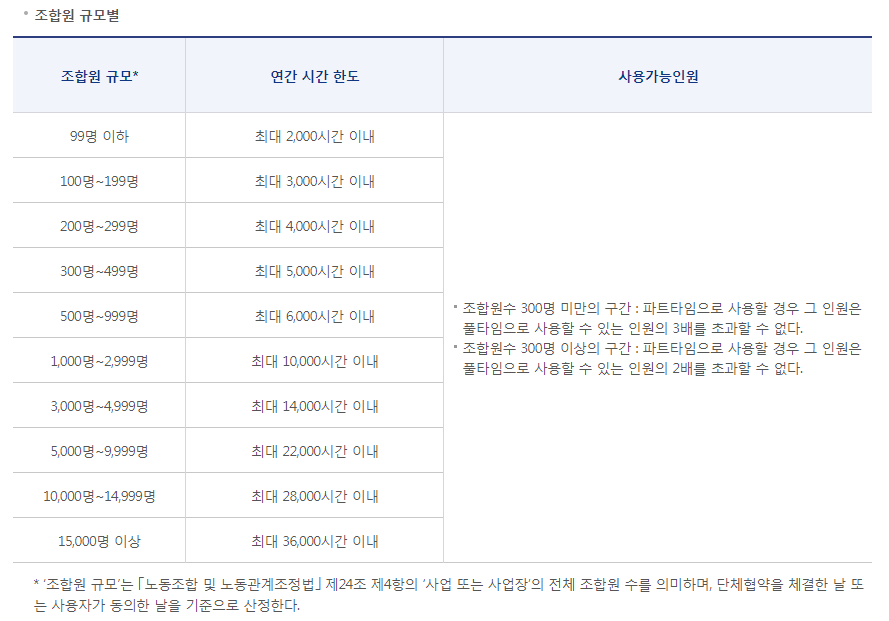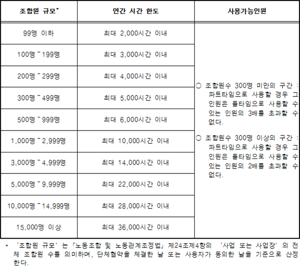 질문하신 내용에 대하여 아래와 같이 답변 드립니다.노사 당사자는 조합원 규모별로 정해진 근로시간면제 한도 (고용노동부고시 제2013-31호)를 초과하지 않는 범위 내에서 단체협약 또는 사용자의 동의하에 자율적으로 근로시간면제 시간및 인원을 정하여야 합니다. 그리고 근로시간면제 한도 고시 범위 내에서 사업특성에 따라 단체협약 등으로 근로시간면제자의 수를 정하여야 하며 근로시간면제 한도의 사용가능 인원(파트타임 사용가능 인원) 보다 사용인원을 늘리는 것은 허용되지 않습니다.