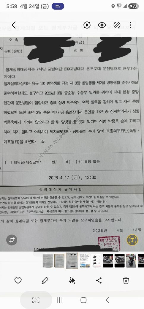 굱생활중 폭행으로 조사받고 군검찰로 넘긴다는 말씀이신듯 합닞다. 감봉으로 징계가 끝났는줄 알았구요. 5월4일 전역전 끝날수 있는지 횡보관님께 물어보시고 전역에 문제 없는지 확인해보세요. 대한법률구조공단에 자문 받아보시는것이 좋을듯 합니다.
