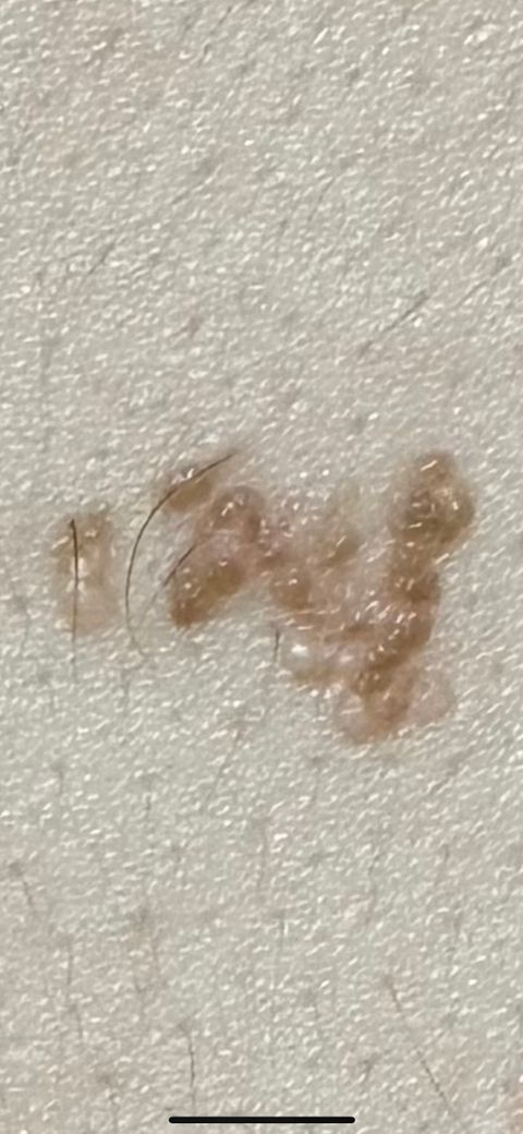 사진으로 수포인지 아닌지 정확하게 확인이 안되는데 그렇다는 전제하에 답변 드리자면 가장 흔한 원인으로는 수포성 피부염, 단순 포진, 또는 피부의 양성 종양(지방종이나 피지낭종)이 있을 수 있습니다. 갈색의 색소 침착은 피부가 자극을 받아 변화한 경우일 수도 있구요. 수포가 아니라면 지방종, 피지낭종 가능성도 여전히 존재하며 태선일수도 있습니다.