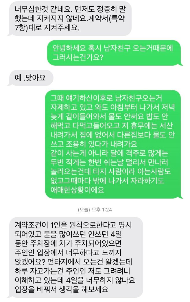 남자친구가 달에 격주로 금토일 또는 이번과같이 연휴가있을때 놀러오곤 합니다. 처음에는 집주인분 께서 수도세로 막 머라 하시더라고요 그러다가 좋게 얘기하고 넘어가고 이번엔 주차 얘기로 트집을 잡으시더군요