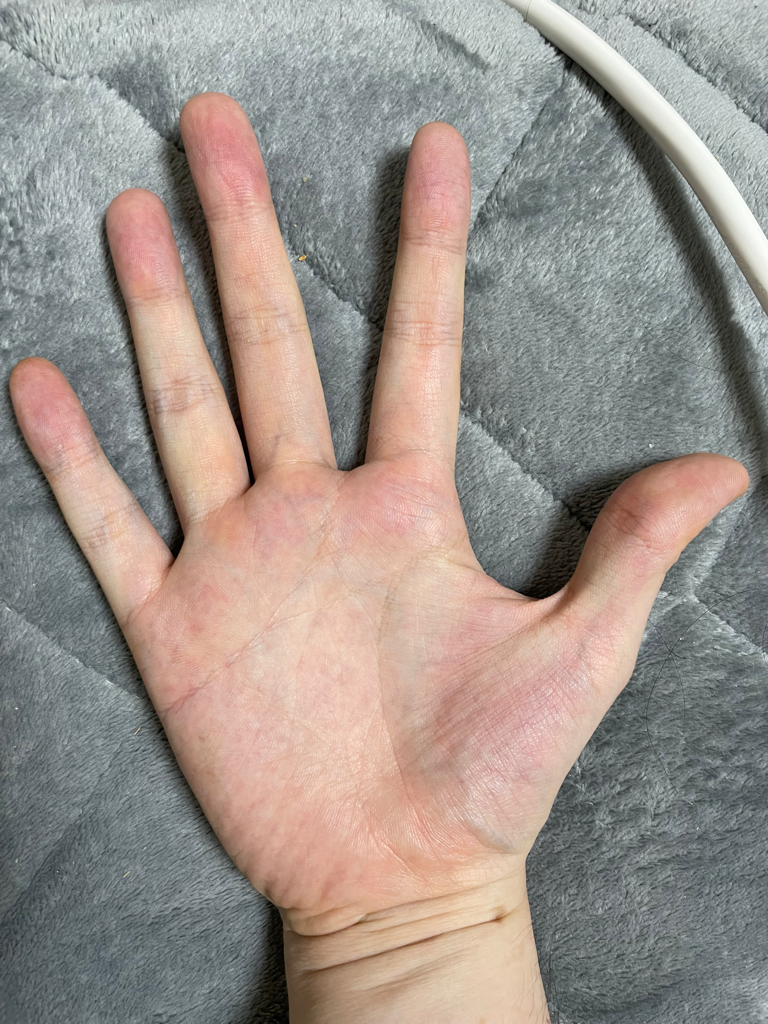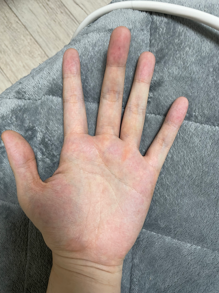 환자분의 경우 사진상으로는 손바닥이 현저하게 붉게 보이지는 않는 것 같습니다.