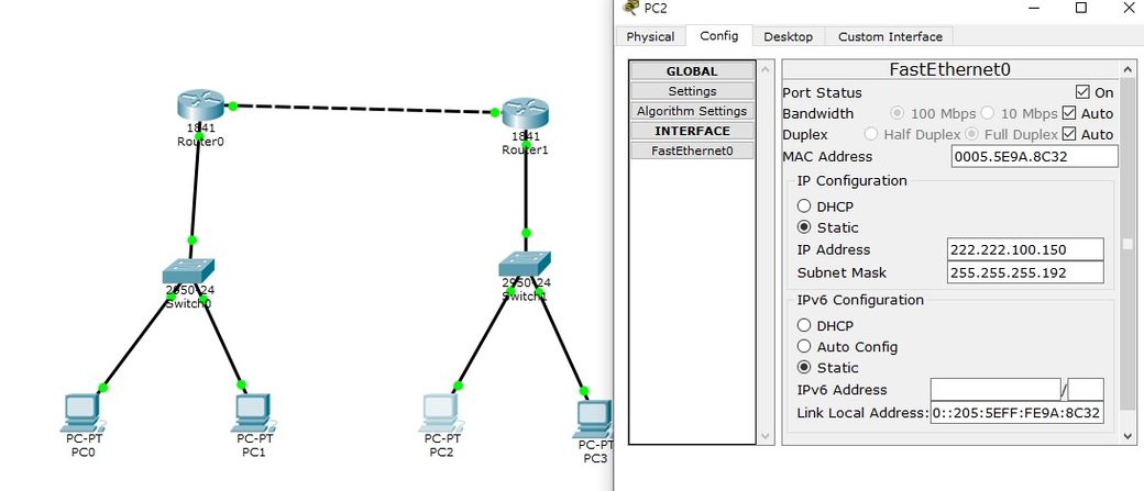 왼쪽 오른쪽의 PC들을 /26 으로 서브넷을 서브넷팅하면...