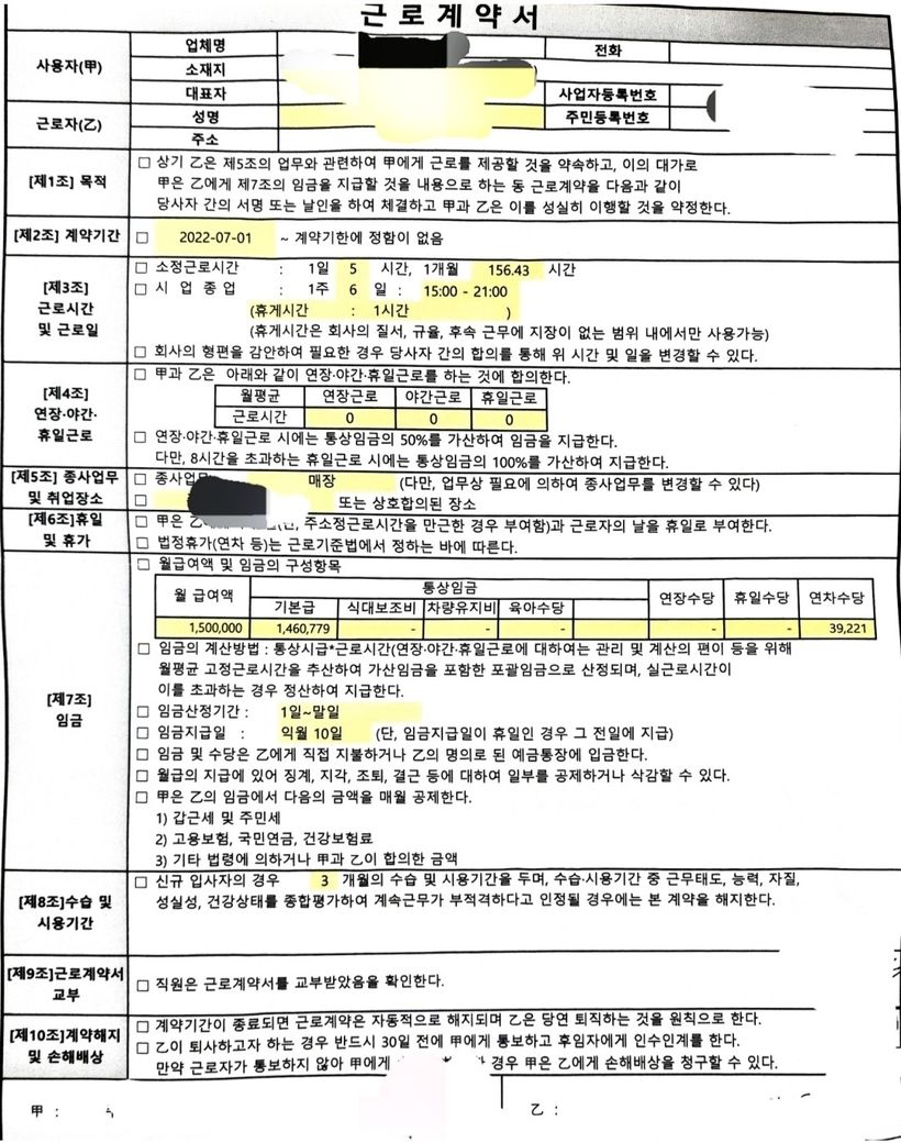 1. 일할계산을 하기 위해서는 우선 위 급여가 법에 미달되는 것은 아닌지를 확인해보아야 합니다. 그런데 이를 알기 위해서는 사업장의 상시 근로자 수가 5인 이상인지 등을 알아야 하는데, 이에 대한 내용이 없으므로 일단 위 급여가 적법하다는 것을 전제하고 계산하겠습니다. 다만 첫 페이지의 근로계약서는 최저임금 이상의 급여가 지급되는 것으로 보입니다.