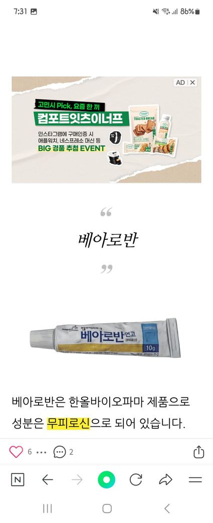 네, 어린이집에서 바른 벤트플라겔(히알루론산 성분의 타박상/염증 완화 연고)을 2~3회 정도 사용한 뒤, 이후에는 소아과에서 처방받은 항생제 연고인 베아로반(무피로신)만 단독으로 바르셔도 괜찮습니다. 벤트플라겔은 멍과 가벼운 염증, 상처 회복을 돕는 연고고, 베아로반은 상처 부위에 세균 감염을 막기 위해 쓰이는 국소 항생제로, 기능이 다르기 때문에 초기에 벤트플라겔을 사용했다 하더라도 지금은 감염 예방에 더 집중하는 게 중요해요.