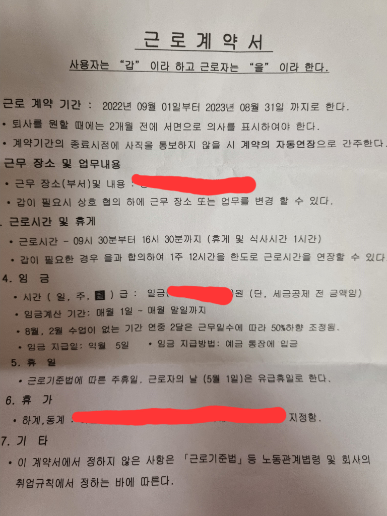 1. 올려주신 근로계약서 사진은 근로계약 체결을 내용으로 하는 근로계약서에 해당한다고 볼 수 있습니다.