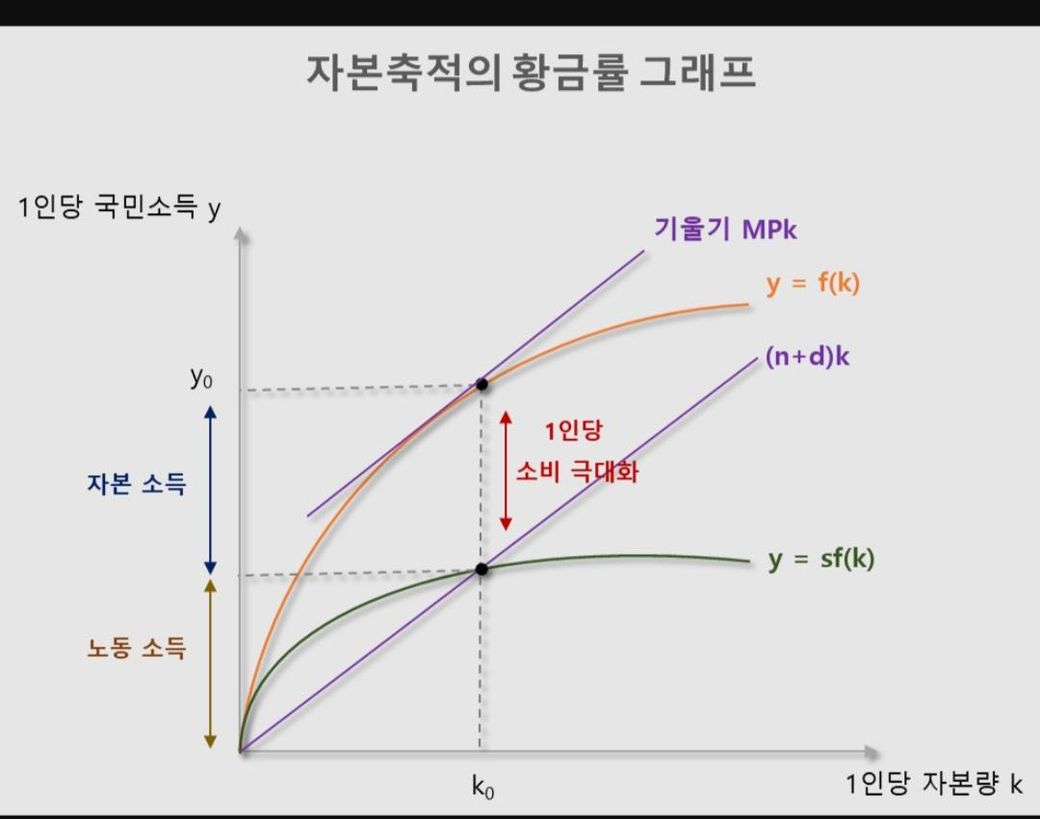 솔로우 모형의 황금률은 1인당 소비를 극대화하는 자본 수준을 찾는 게 핵심인데, "자본소득은 저축에, 노동소득은 소비에 쓰인다"는 말은 소득의 주된 사용처를 일반적인 경향으로 비유한 것으로, 실제로는 경제 전체의 총생산(노동소득과 자본소득을 포함)에서 투자를 제외한 부분이 소비로 사용되기에, 그래프에서 자본소득이 소비에 쓰이는 것처럼 보이는 건 전체 소득의 흐름 속에서 자연스러운 것이죠. 자본소득도 결국은 경제 활동을 통해 얻어지는 소득의 일부로서, 소비를 가능하게 하는 원천이 될 수 있다고 이해하면 됩니다.