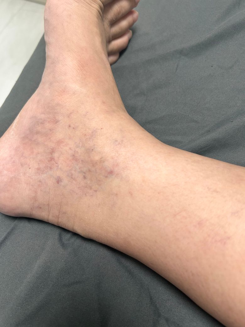 발목쪽이 특히 심하고 종아리도 이런식으로 곳곳에 실핏줄이 터져있습니다안녕하세요. 최병관 내과 전문의입니다.