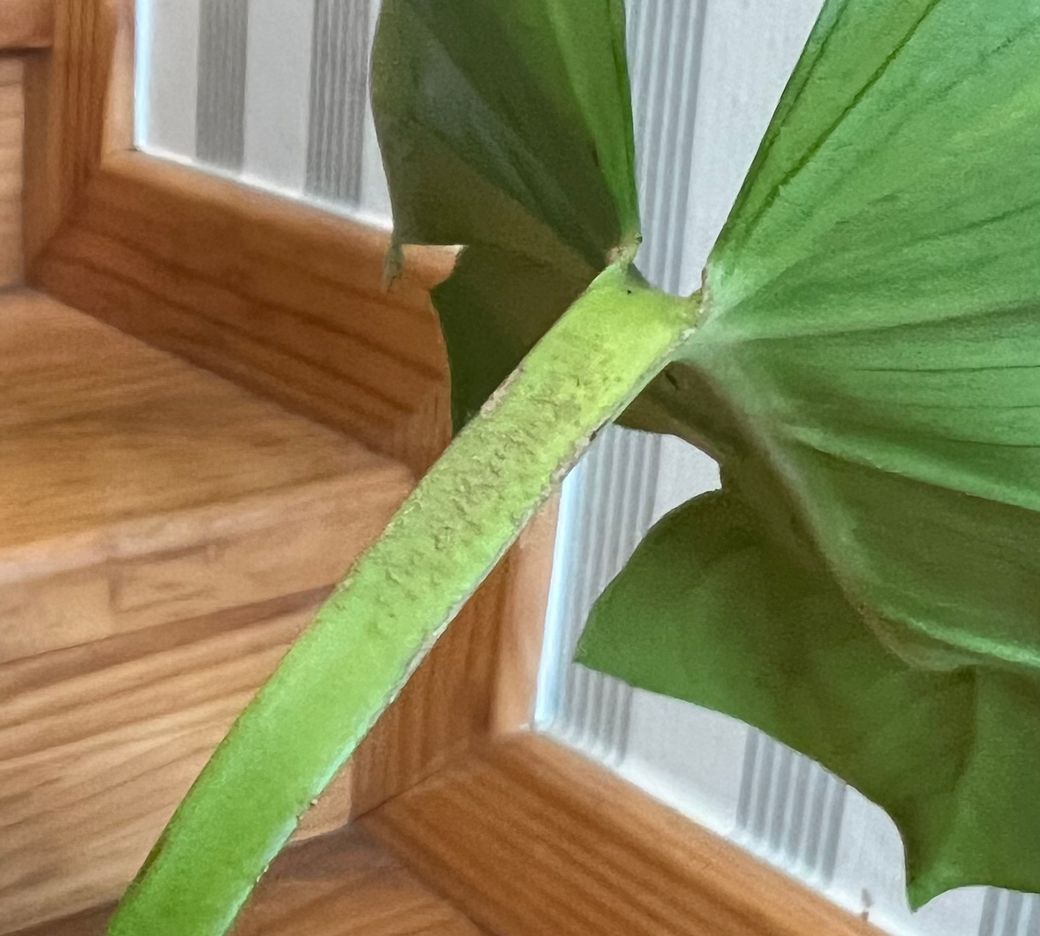 사진 상으로는 분필병으로 보입니다. 주로 곰팡이에 의한 감염으로 발생하는 질병입니다. 감염된 줄기나 잎에 백색 또는 회색의 곰팡이가 퍼지는 증상이 있습니다. 실내 환경을 가급적 습도가 낮은 환경을 유지해 주시고, 곰팡이를 박멸하기 위한 살균제가 시중에 있습니다.