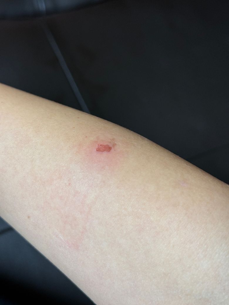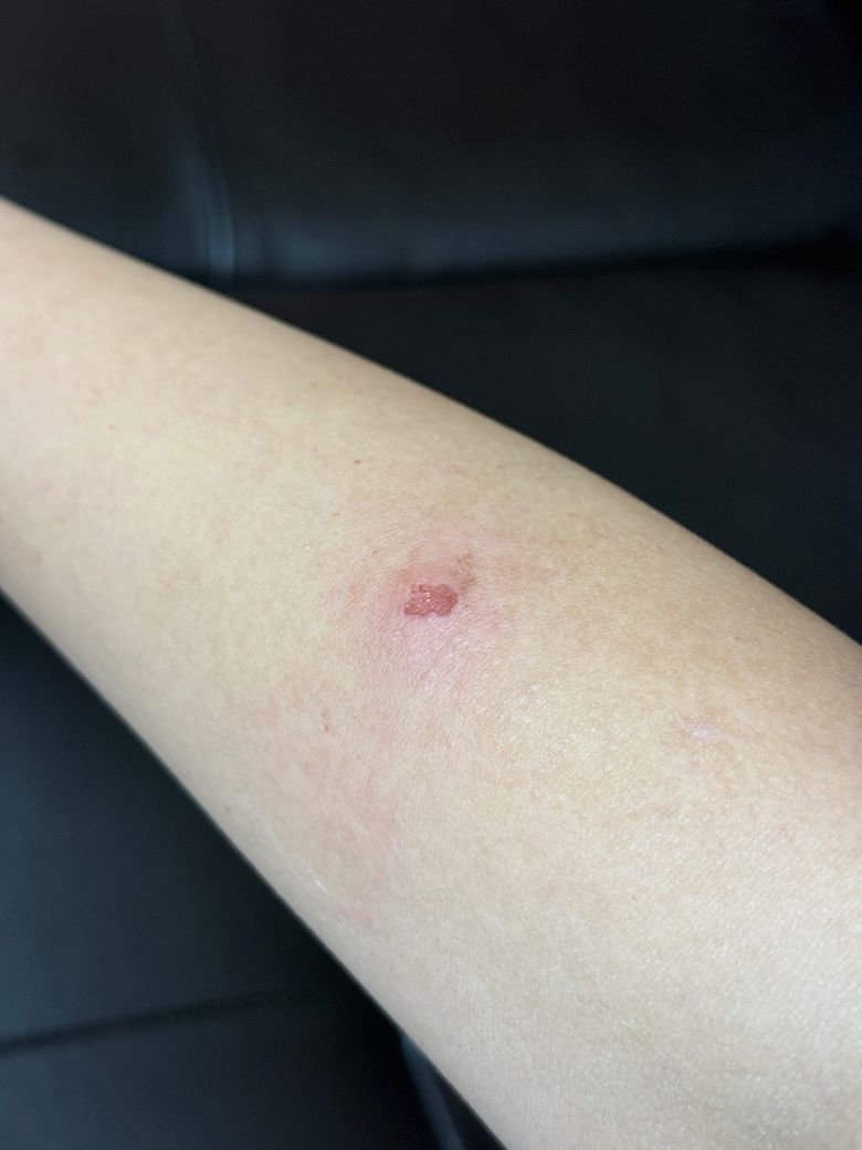 사진상으로는 표재성 피부 손상(찰과상 또는 얕은 화상/마찰손상)에 2차 염증이 동반된 양상으로 보입니다. 주변 발적, 열감, 압통이 있다는 점에서 국소 염증 반응이 진행 중인 상태로 판단됩니다.