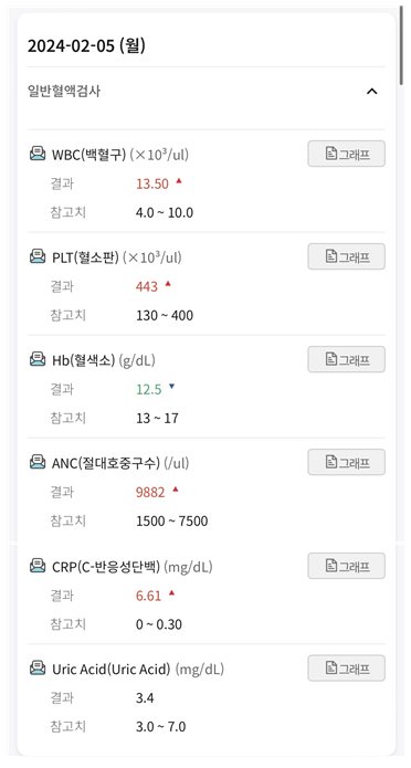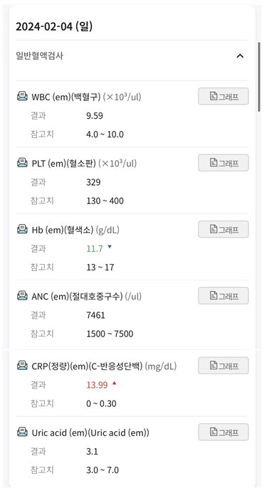 폐암 수술 직후 폐렴 관련 피검사결과