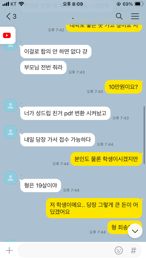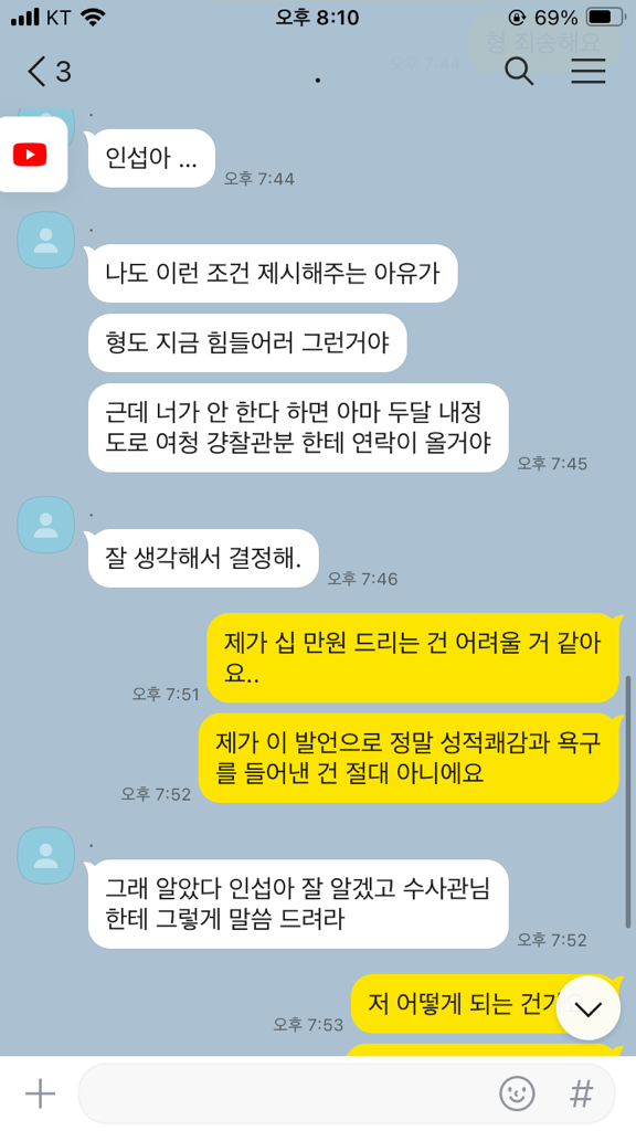 " 너희 어머니 ㅂㅈ에 박고싶다 " " 오ㄴ홀로 만들어도 되냐 " 라는 발언을 사용 했습니다. 이 말을 하고 몇 분 지나지 않아 상대방의 개인 톡으로 가서 아래 사진에 보이시는 대로 사과를 했습니다 그러자 상대방이 " 돈 좀 있냐 " " 지금 얼마있냐 " 라는 말을 합니다. 꼭 돈을 보내지 않으면 내일 고소 접수한다는 것 처럼요. 저 또한 이 발언으로 정말 성적쾌감과 욕구를 들어낸 건 절대 아닙니다. 저는 이제 고등학생 1학년 그러니까 17살인데 인생 이렇게 망하기 싫습니다 부모님 가슴에 대못 박히기 싫어서 이렇게 글 올려봅니다.