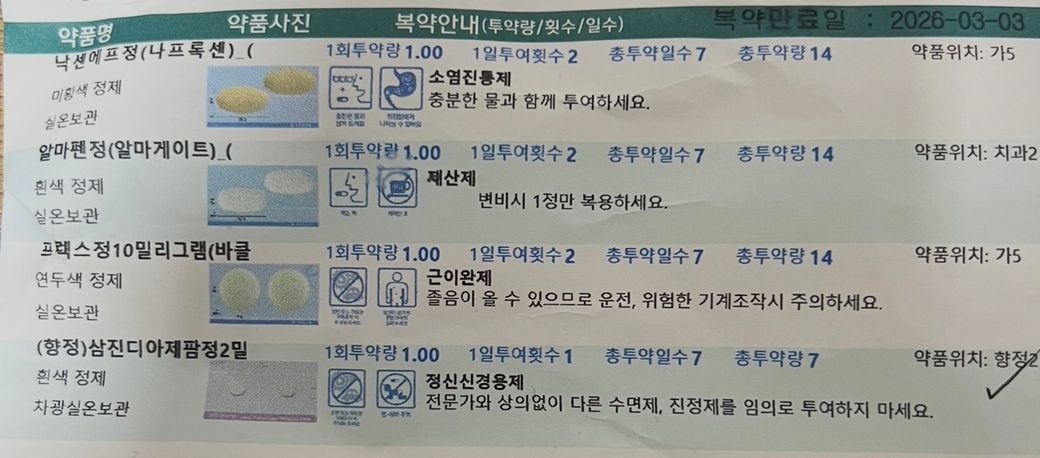 안녕하세요. 턱관절때문에 고향에 있는 구강내과 방문 후 약 처방받고 다시 대학에 올라와 다른 구강내과에 방문해 턱관절 시술을 받았습니다. 오늘 15시경에 보톡스를 시술받았습니다. 그런데 이전에 먹던 약들이 하루치가 남았는데 오늘 저녁약까지 해서 해당약들을 마저 복용해도 문제가 없을까요?
