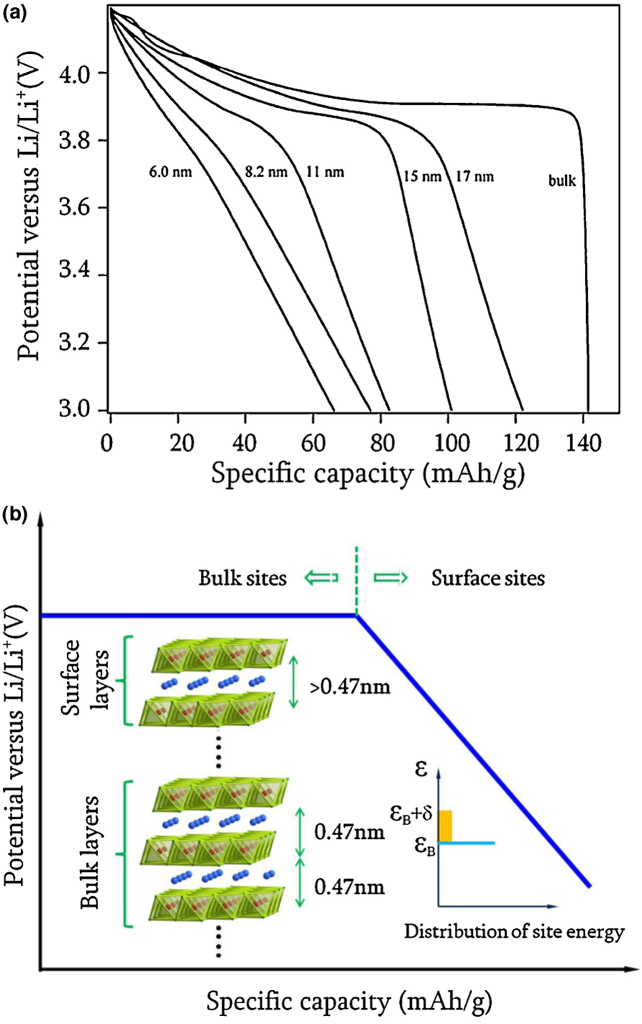 위 그래프(a)는 리튬이온 배터리의 특정 크기(6.0nm~bulk)의 입자들에서 방출하는 전압과 용량 변화를 나타냅니다. 입자가 작아질수록 표면층에 리튬이온이 더 많이 삽입되어 커패시터 거동이 증가해 초기 전압이 빠르게 떨어지며 가파른 곡선을 보입니다. 하지만 입자가 너무 작으면 내부의 규칙적인 결정구조(벌크구조)가 파괴되어 리튬이온이 안정적으로 저장되지 못해 전체 용량(비용량)이 줄어드는 원리입니다.