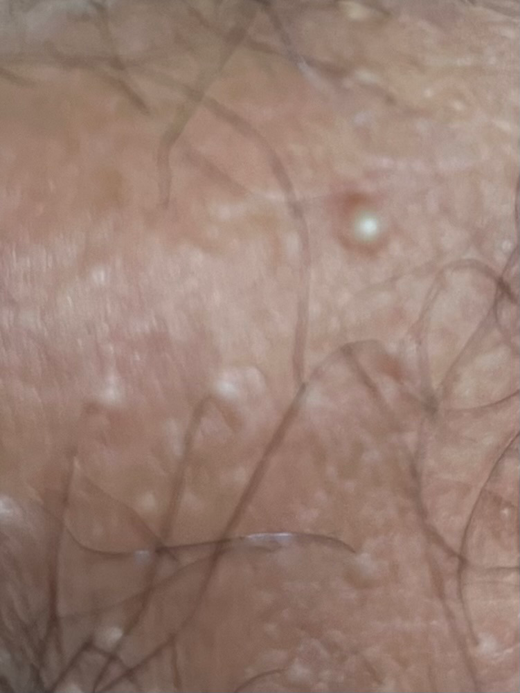 피지샘증식증(피지샘융기, 포다이스병등)이며 피부의 피지샘이 두드러지게 보이는 현상으로