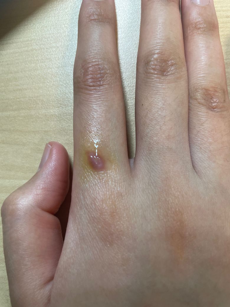 사진상 단순 베인 상처가 지연 치유되는 양상이라기보다는, 세균 감염으로 인해 피부 아래에 고름이 고인 농양 형태로 진행된 가능성이 높습니다. 중심부가 융기되고 색이 변해 있으며 주변으로 붉은 기와 부종이 동반된 점, 그리고 2주 가까이 호전 없이 고름이 지속된다는 점은 단순 상처 회복 단계로 보기 어렵습니다.