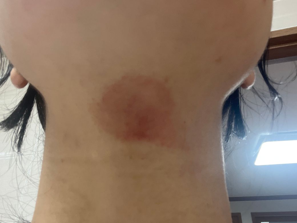 목에 몇 주 전부터 사진과 같이 붉은 것이 생겼는데 무엇인가요...? 실제로 보면 조금 더 붉은 느낌 입니다. 이 부분은 만지면 건조한 느낌이 들고 특히 더울때 더 간지러워요..