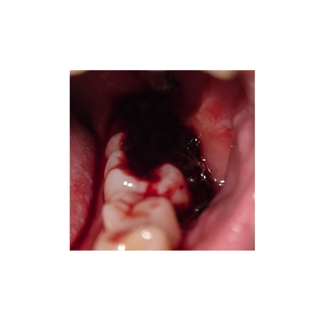 현 상태는 사진 상으로 봤을때 출혈이 지속되는 상황으로 지혈처치 요하리라 사료됩니다. 환자분께서 당장 하실 수 있는것은 약국에서 거즈 사서 발치 부위에 적용하고 물고계시는것을 할 수 있습니다.
