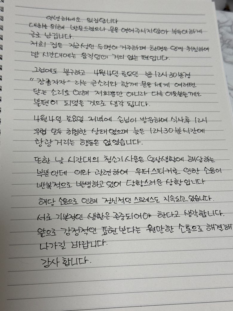 “잠 좀 자자”라는 큰 소리와 함께 문을 여러 차례 세게 닫는 소리로 인해 저희뿐만 아니라 다른 이웃분들께도 불편이 되었을 것으로 생각됩니다.