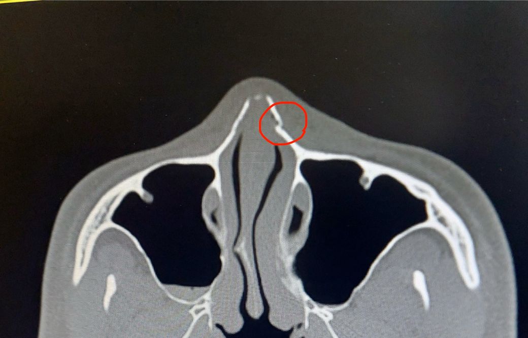 제공하신 CT 이미지 기준으로만 말씀드리면, 붉은 표시 부위는 코뼈(비골) 상부에 비교적 얇은 골절선 또는 약간의 함몰로 보입니다. 다만 CT 1컷만으로 정확한 변위(밀린 정도)와 측면 변형 여부를 완전히 판단하기는 제한이 있습니다. 그 점을 전제로 설명드립니다.