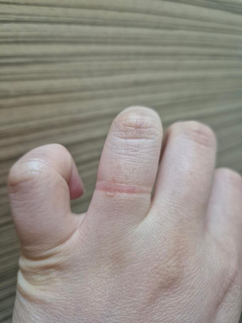 사진상으로는 반지 압박으로 인한 국소 피부 자극과 경미한 접촉성 피부염 양상으로 보입니다. 피부가 눌리면서 각질층이 손상되고, 마찰과 땀, 금속 성분(니켈 등)에 의해 염증이 생긴 상황으로 해석됩니다.