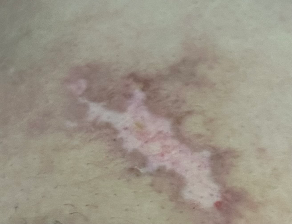현재 흉터가 남은 것으로 이 경우 색소가 침착된 부위증상을 완화하는데 효과가 있는 스카덤겔 흉터연고를 사용하셔도 됩니다.