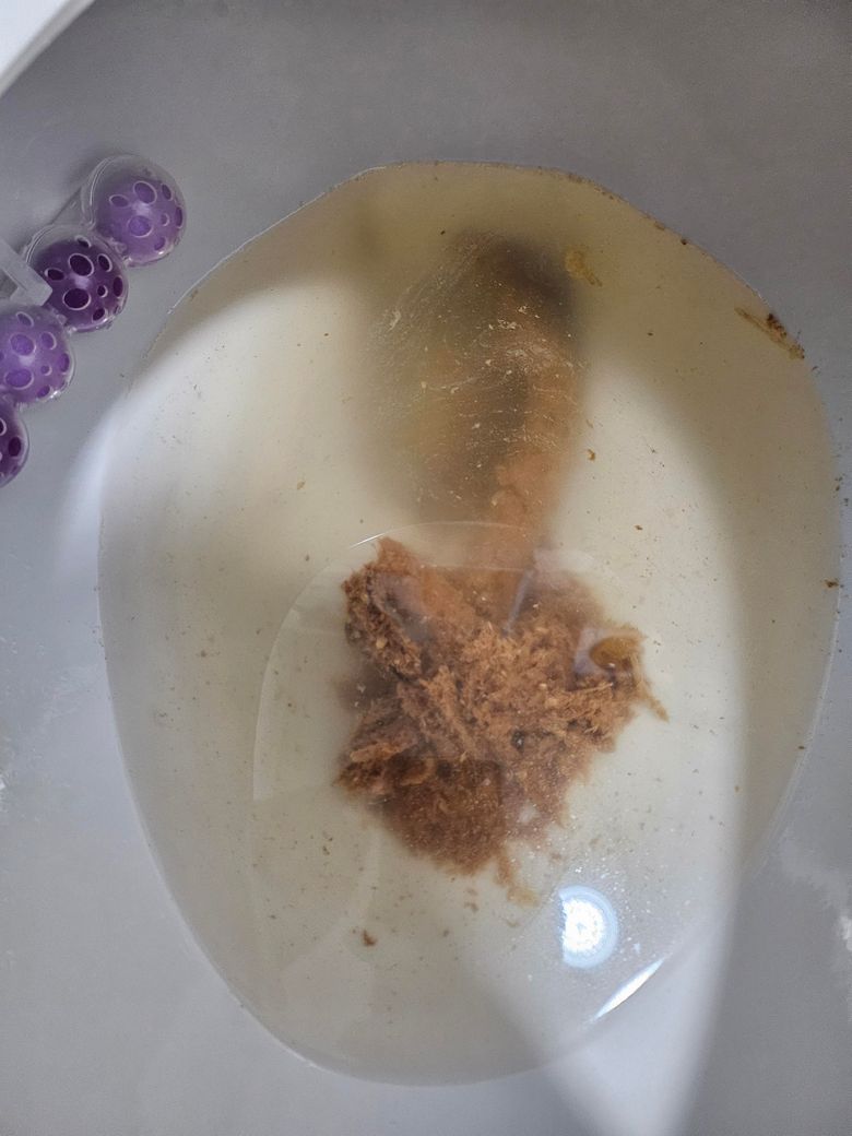 올려주신 사진으로 미루어 무른변이 풀어지며 변기물에 뜨는 것으로 생각됩니다.