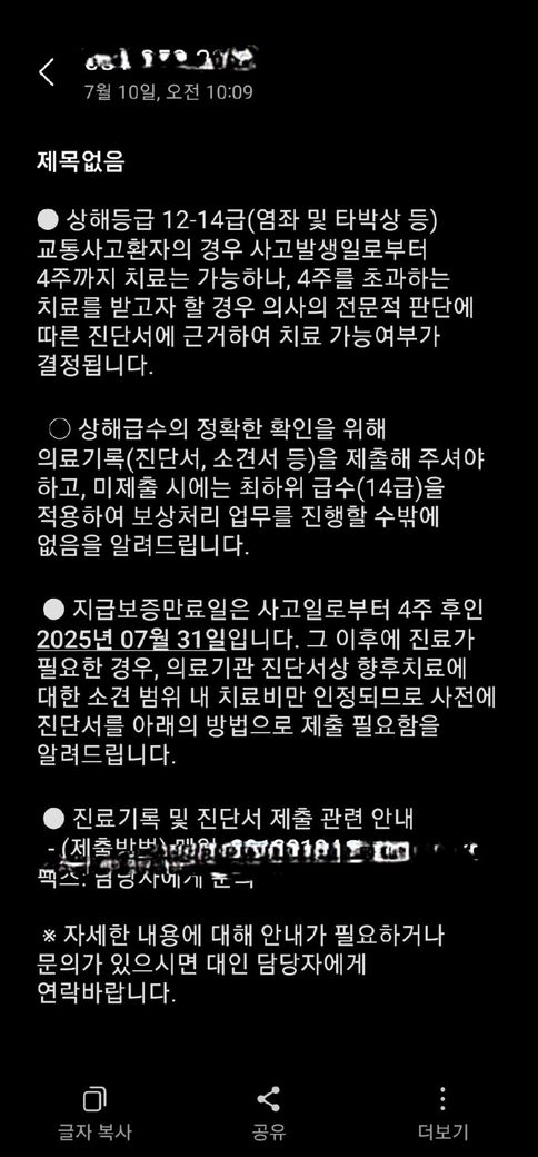 7월4일 무과실 교통사고로 현재 8일정도 통원치료 중인데요..10일 보험사에서 이런문자를 받았는데 진단서 보내라는건가요?10날 보험사 대인담당자 연락오구 몸좀어떻시냐?등등 치료잘받으시라고 하고 합의관련말은 없었는데요..전화끊고 이런문자가 와서요 통상적인 안내문자인가요?