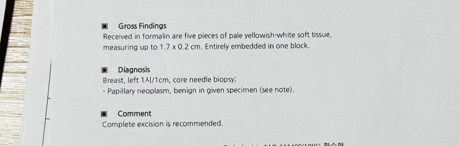 얼마 전 건강검진에서 유방초음파를 받던 중 모양이 좋지 않은 결절을 발견하여, 개인 병원에서 다시 초음파 후 조직검사를 한 결과 유두종 판정을 받았습니다. 여기서 질문입니다.