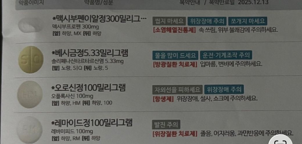 사진에 보이는 방광염 처방에 덱시부프로펜 300mg(소염진통제)가 포함되어 있어서, 같은 날에 “그날엔 큐정”이 또 다른 소염진통제 계열이라면 위장장애와 신장 부담이 늘어 중복 복용은 피하시는 쪽이 안전합니다. 두통 조절이 필요하면 그날엔 큐정보다 아세트아미노펜(타이레놀 계열)로 보완하는 방법을 권장드립니다. 다만 그날엔 큐정이 정확히 어떤 성분인지에 따라 달라질 수 있으니, 포장에 적힌 주성분만 확인해 주시면 “중복인지 아닌지”를 딱 잘라 안내드릴게요. 감사합니다.