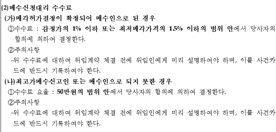 법원 경매 중개수수료는 감정가의 1%이하 또는 최저매각가격의 1.5%중 당사자의 합의에 의하여 결정한다고 되어있습니다.