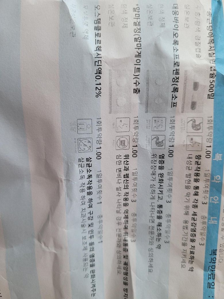 현재 복용 약은 종근당아목시실린캡슐, 대웅바이오록소프로펜정, 알마게이트정으로