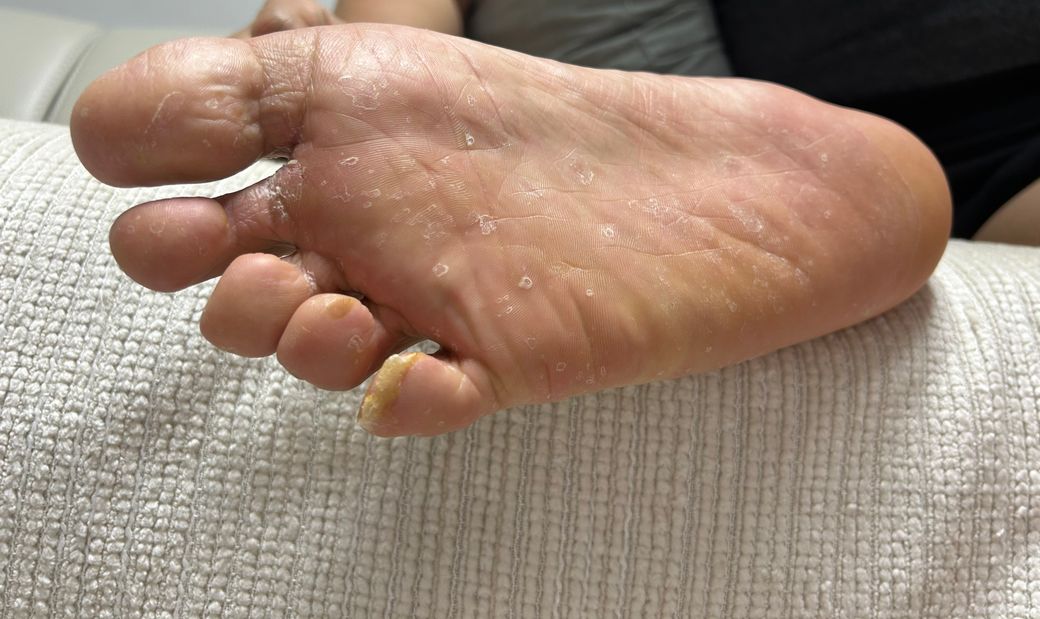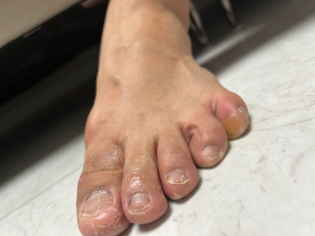 사진만으로 정확한 감별진단까지 내리기는 어렵습니다만 무좀 등의 피부 질환을 의심해보아야 하겠습니다. 방치하시기 보다는 피부과에 다니면서 치료를 받으시는 것이 적절할 것으로 사료됩니다.
